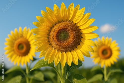 © AbstractAI, Fototapeta premium Close-up of three sunflowers with one prominently in focus and the others blurred in the background