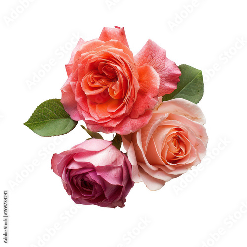 © zea, Fototapeta premium Close-up of three vibrant roses in peach, pink, and coral hues