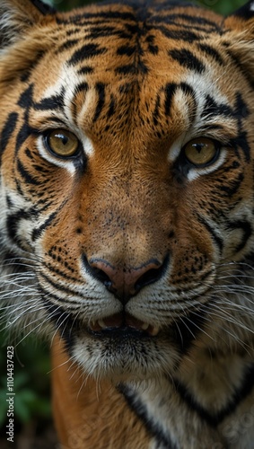 Fototapeta premium Close-up of tiger’s intense face in jungle.