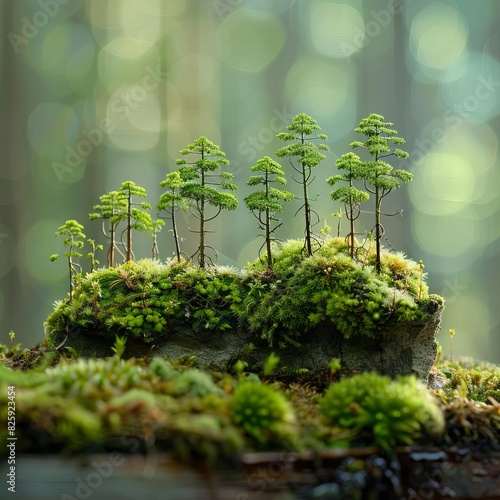 © Pairat, Fototapeta premium Close-up of tiny forest moss and miniature trees growing on a log in a blurred green forest background.