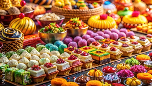 Fototapeta premium Close-Up of Traditional Sweets and Desserts on a Beautifully Decorated Table Showcasing the Rich Colors and Textures of Exquisite Treats for a Festive Celebration