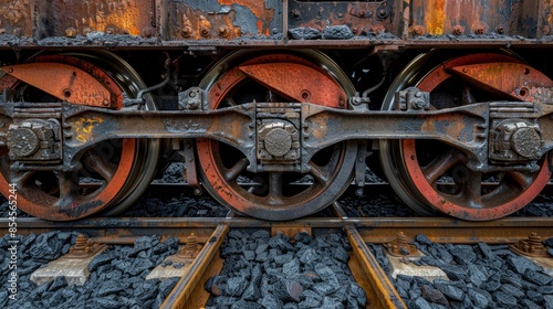 Naklejka premium Close-up of train wheels on rails, locomotive transporting coal, detailed and gritty, along railroad tracks, industrial vibe