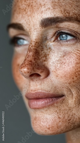 © wang, Fototapeta premium Close-up of translucent aging skin with rejuvenating light beams, soft-focus tools in background - modern dermatology innovation