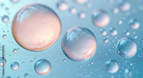Obraz premium Close-up of translucent liquid droplets in varying sizes floating on a smooth surface with soft blue and peach tones creating a serene and gentle effect