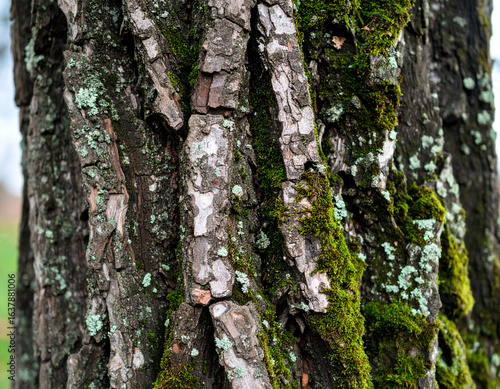 © Anika Visual, Obraz premium Close-up of Tree Bark with Moss and Lichen Texture Detail