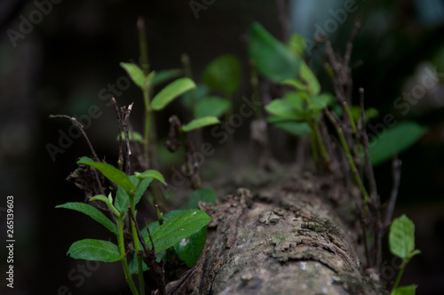 Obraz premium Close up of tree log with young growth, fragile verdure shoots