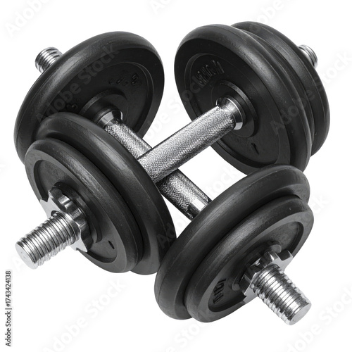 © Abu, Naklejka premium Close-up of two black and silver dumbbells crossed on a transparent background