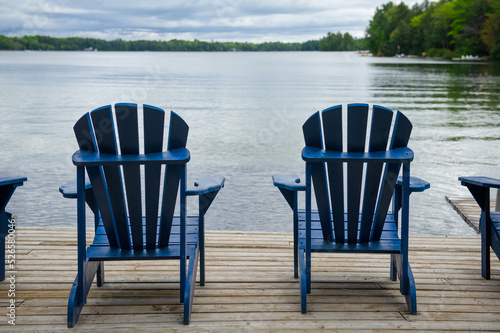 Fototapeta premium Close up of two blue Adirondack chairs on a wooden dock facing a lake in Muskoka, Ontario.