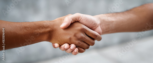 Fototapeta premium Close-up of two diverse hands shaking in agreement symbolizing unity and...