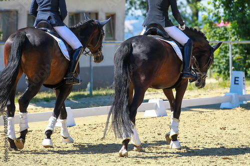 Obraz premium Close-up of two dressage horses with rider in the crotch, photographed from behind before the award ceremony..