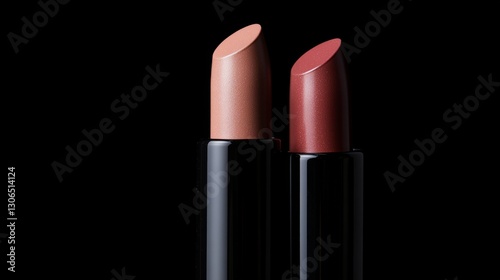 © Winter KD, Obraz premium Close-up of two elegant lipstick tubes with vibrant colors against a dark background, perfect for beauty and cosmetic promotions and branding purposes