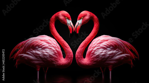Obraz premium Close up of two flamingos touching making a heart shape. with over black...
