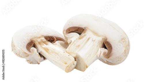 Fototapeta premium Close-up of two halves of a sliced, white edible fungi, displaying textured,...