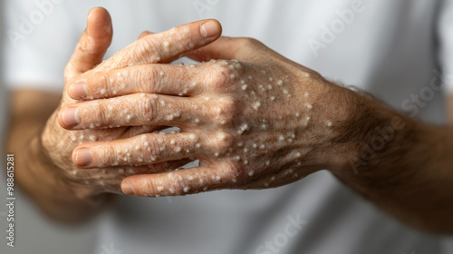 © Daria94, Fototapeta premium Close-up of two hands covered with festering blisters, infected with monkeypox, against a neutral background.