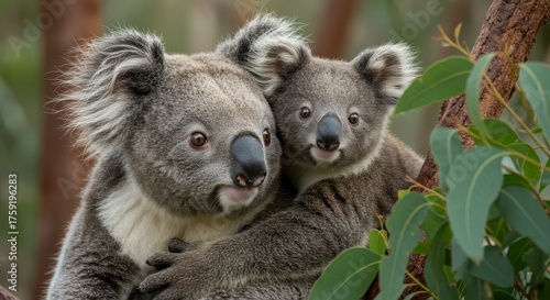 Naklejka premium Close up of two koalas cuddling on a tree branch with green foliage