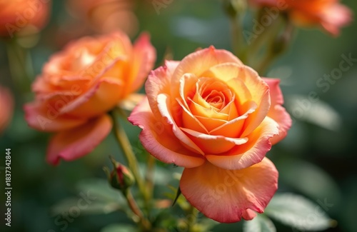 © Vadym, Naklejka premium Close up of two orange roses in bloom with soft pink edges. A rose bud is visible below. Gentle sunlight illuminates petals, rich green leaves backdrop.