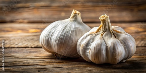 © Kukar Studio, Obraz premium Close-up of two plump garlic cloves with dry, papery skin on a wooden table, garlic, cloves, close-up, rustic, wooden, table