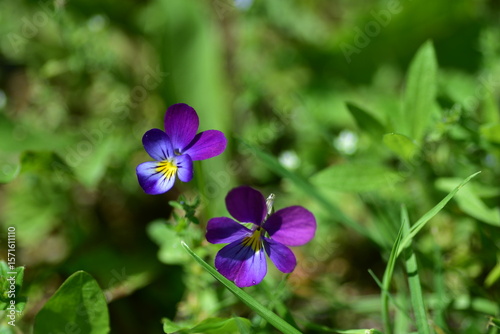© Karolina, Fototapeta premium Close-up of two purple wild violet flowers blooming in green meadow on sunny day. Delicate petals and soft focus background create a peaceful and natural springtime scene. Viola tricolor hortensis