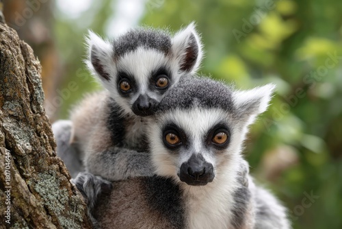 © capylines, Naklejka premium Close-up of two ring-tailed lemurs, a mother and baby, on a tree
