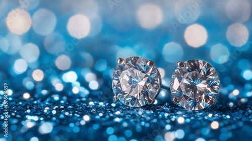 Fototapeta premium Close-up of two sparkling diamond stud earrings on a blue glitter background.