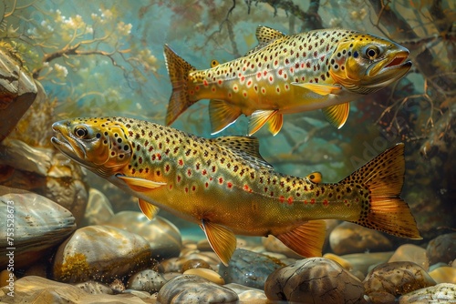 © Tetiana Kasatkina, Naklejka premium Close-up of two trout in the clear fresh water of a mountain lake.