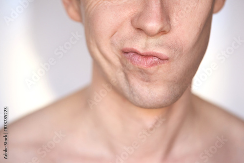 © elenavolf, Obraz premium Close-up of uncertain expression on man face with pursed lips against neutral background