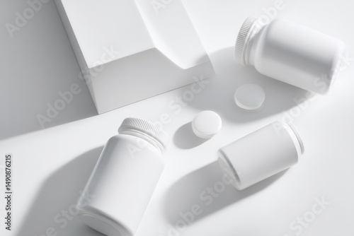 Fototapeta premium close-up of various modern pill bottles scattered over white background