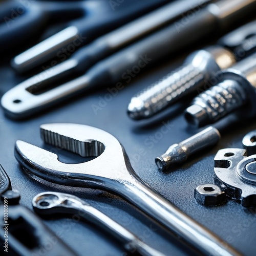© STwul, Fototapeta premium Close-up of various shiny metal tools on a dark surface.