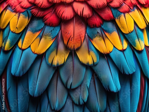 Fototapeta premium Close-up of vibrant, colorful feathers showcasing shades of red, yellow, and blue, depicting the intricate texture and beauty of avian plumage.