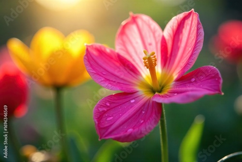 Fototapeta premium Close-up of vibrant flowers, petals unfurling to reveal their fragrant heart, dew drops glistening, sunlight illuminating the scene, a burst of springtime freshness , flower power, vibrant
