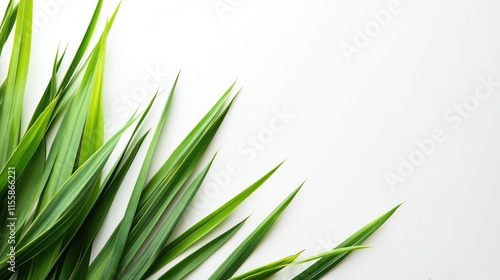 Obraz premium Close up of vibrant fresh lemongrass leaves arranged elegantly on white background with ample space for text and creative design elements