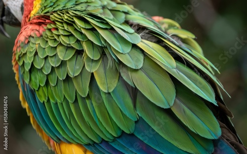 © Roksana, Fototapeta premium Close up of vibrant green and blue feathers on a colorful macaw bird