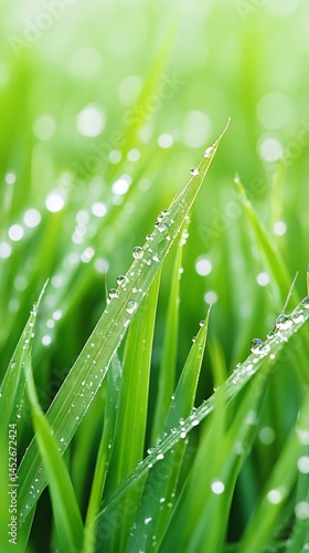Fototapeta premium Close up of vibrant green grass blades adorned with glistening water droplets...