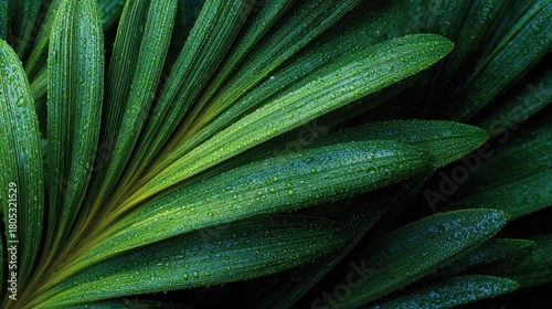 Fototapeta premium Close up of vibrant green palm leaf showing natural textures and water...