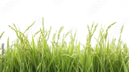 © sablengjago, Fototapeta premium Close-up of vibrant green rice plants with grains developing against a white background.