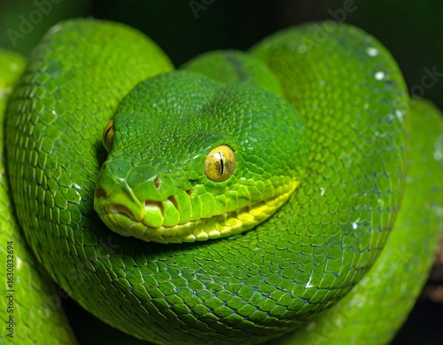 © mahadewi, Fototapeta premium Close-up of vibrant green snake (1)