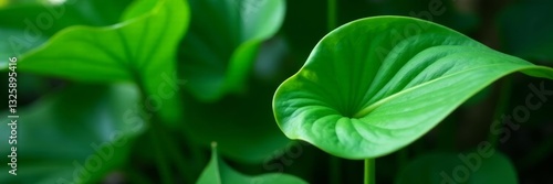 Fototapeta premium Close-up of vibrant green spathiphyllum peace lily leaves, tropical foliage, lush, botanical