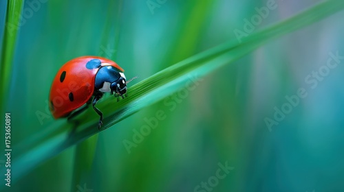 © Tyrah, Obraz premium Close up of vibrant ladybug on blade of grass in nature