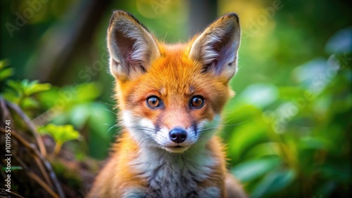 © Danicha, Fototapeta premium Close-Up of Vibrant Orange Fox Pup with Striking Eyes in Natural Woodland Habitat During Daylight