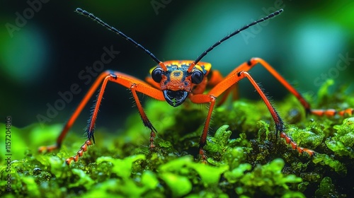 Fototapeta premium Close-up of vibrant orange insect on green moss.