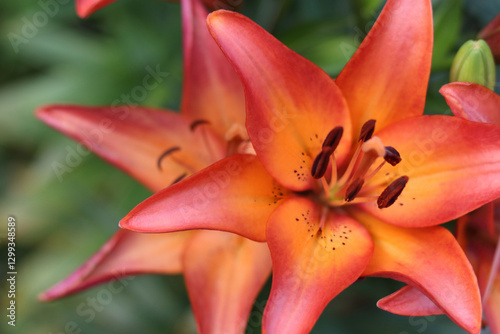 Fototapeta premium Close-up of vibrant orange lilies in full bloom with delicate petals and...