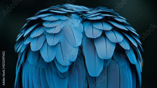 Fototapeta premium Close-up of vibrant parrot feathers showcasing intricate details and patterns, illuminated by natural light, with a blurred background and empty space for captions or design elements