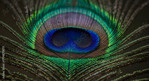 © Segi Empat Studio, Naklejka premium Close Up of Vibrant Peacock Feather with Bright Blue Green and Brown Colors in Macro Style