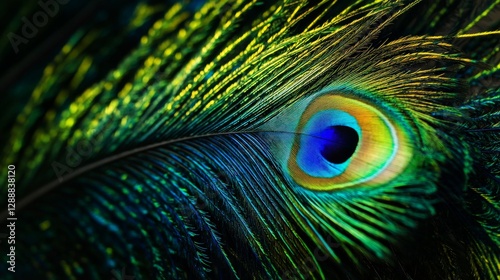 © Kenny, Obraz premium Close-up of vibrant peacock feather with iridescent colors and eye pattern
