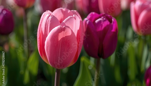 Fototapeta premium Close-up of vibrant pink and purple tulips in spring sunlight, ideal for floral layouts