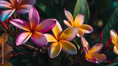 Fototapeta premium Close-up of vibrant plumeria blossoms.