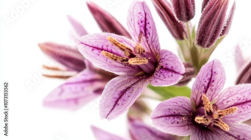 Naklejka premium Close-up of vibrant purple lilies with delicate petals and stamen on a white...