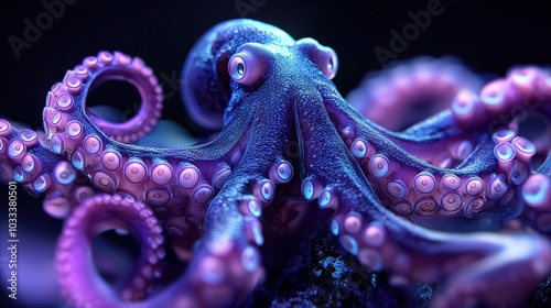 © BOJOShop, Obraz premium Close up of Vibrant Purple Octopus with Suction Cups on Coral Reef