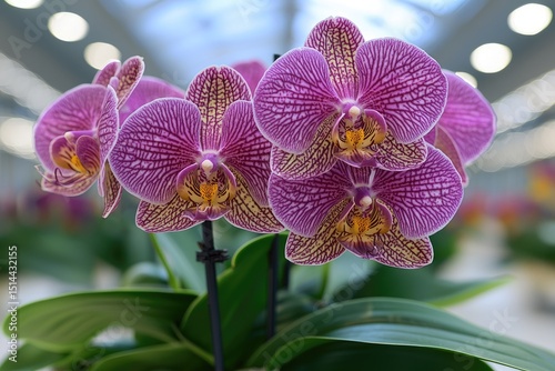 © jemb, Fototapeta premium Close-up of vibrant purple orchids in a greenhouse setting.