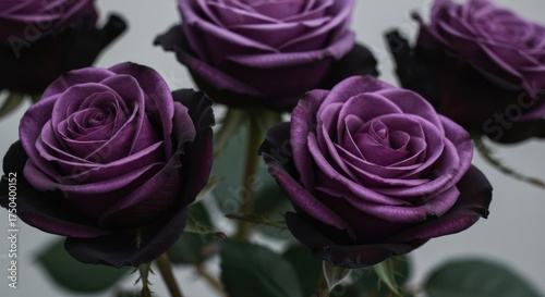 Fototapeta premium Close-up of vibrant purple roses with dark edges, displayed against a neutral...